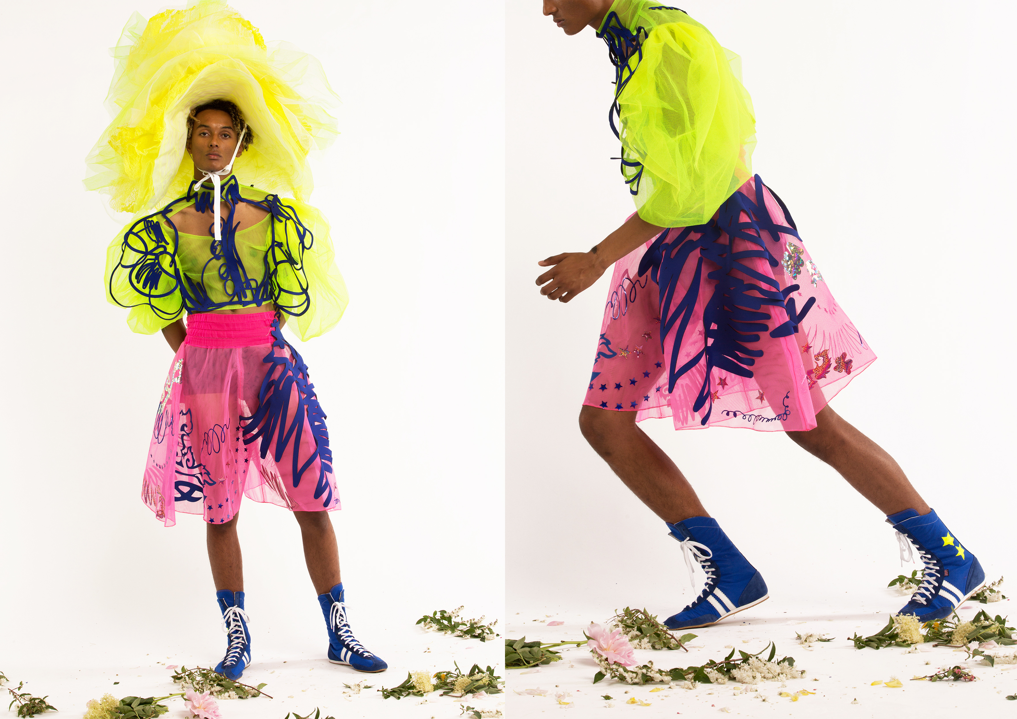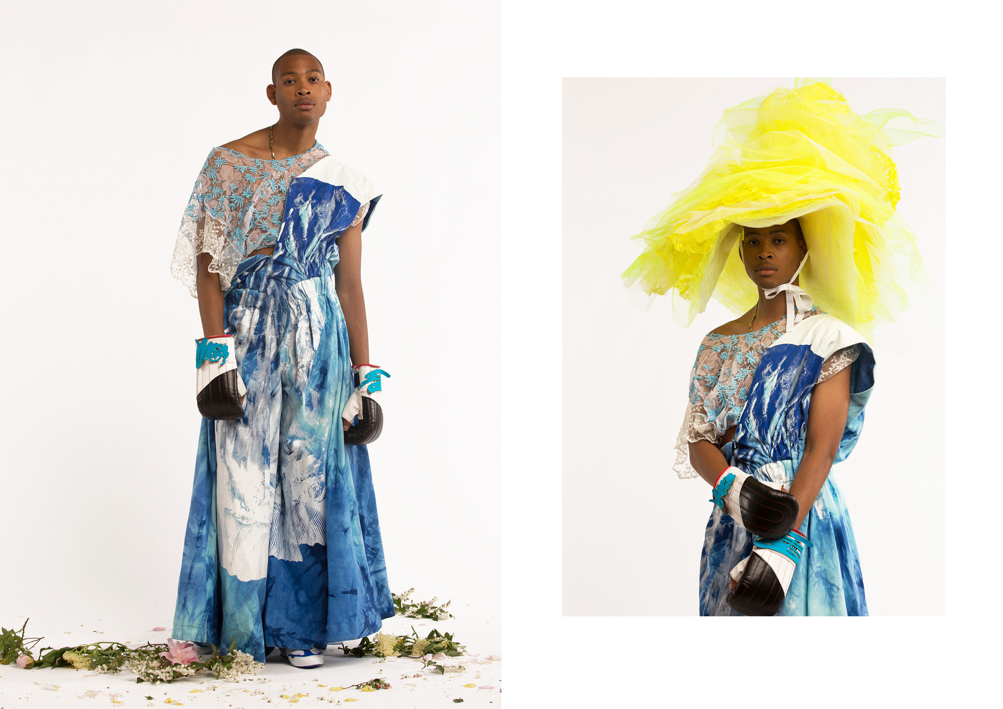 Fashion design, accessories (hats) and textiles (screen printing, tie-dye, cyanotypes, puff binders on lace and hat) for my BA final collection
